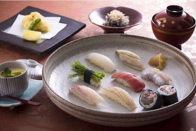 兵庫の豊潤な海の幸が愉しめるコース。まずは揚げ物に淡路産鱧の天ぷらが登場。秋を迎えて脂がのった“名残り”の味をご堪能ください。メインの寿司は、瀬戸内産や淡路産の太刀魚、サヨリ、鯛、イカのほか、トロなど握り7 貫に加え、海鮮巻がラインナップ。新鮮かつ職人の技が光る秋の馳走をお届けします。
