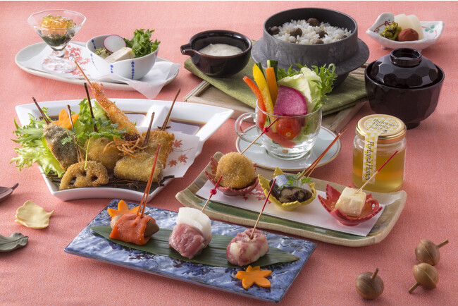香住蟹や播州百日鶏を用いた先付に続き、メインの串あげには多彩な1 2 種が揃い踏み。神戸ビーフ、神戸ポークと淡路玉葱など兵庫食材の串のほか、ホテル敷地内で養蜂・採取した「ポートピアハニー」とチーズ、明石名物玉子焼きなど、名産のアレンジ串も登場。締めは、丹波産山の芋とろろとむかご飯でほっこりと。