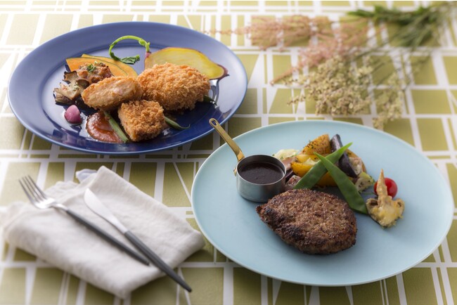 しっかりとした旨みの淡路産「えびすもち豚」を使用したジューシーなハンバーグには、特製デミグラスソースと兵庫県産野菜のジャーマンポテト風を添えて。浜坂漁港で水揚げされた赤エビ入りのクリームコロッケは、サクッと香ばしい衣からまろやかなコクと旨みが広がります。お好きな一品をお選びください。