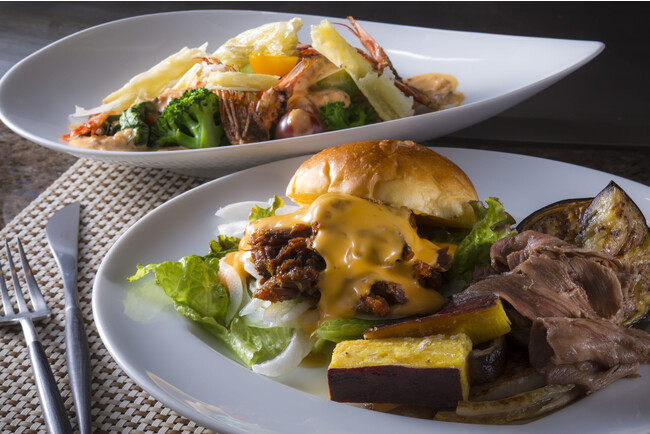 メインは、「盛本牧場」の神戸ビーフを使用したバーガー。とろとろになるまで煮込んだすね肉をほぐした“プルドビーフ”がたっぷり入り、「成井さんちの完熟たまねぎ」やQ・B・Bチェダーチーズのソースが神戸ビーフの深淵なる旨みを引き立てます。頭や尾も全てカリカリの煎餅状に焼いた浜坂漁港の赤エビ入りシーザーサラダの濃厚な味わいもお愉しみに。