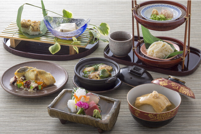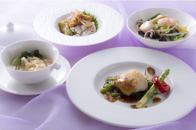 瀬戸内の紅葉鯛、明石のハリイカ、神戸ビーフ、神戸ポーク、旬野菜など、兵庫の力強い食材を駆使して美味豊かな中華のコースに。神戸ポークはしゃぶしゃぶにして秋ナスや茗荷とともに香味ダレで、天然真鯛は網脂を巻いて香り豊かな八宝醤ソースで、ハリイカは鶏白湯のちゃんぽん麺で、と緩急ある味わいで魅了します。趣向を凝らした秋の味覚をご堪能ください。