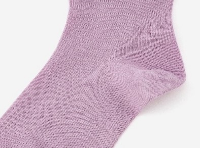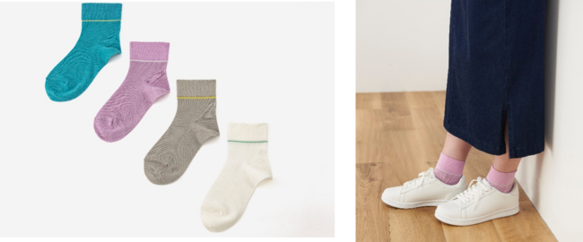 暑い季節はサンダルなどを履く機会が増えて、素足で過ごすことが多いですが、靴下を履いたほうが心地よく感じられるような、清涼感を得られるコットン素材のショートソックスを作りました。スポーティーすぎないデザインにもこだわりました。特殊な紡績で毛羽の出が少ない糸を使い、さらっとした春夏にぴったりの生地。さわるとひんやり感じる、接触冷感機能がついた靴下が完成しました。