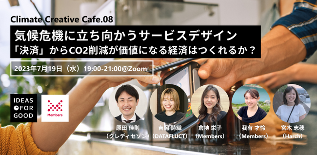IDEAS FOR GOODと株式会社メンバーズは、創造的なアイデアやコミュニケーション、ビジネスモデルの創出を通じて気候危機に立ち向かうプロジェクト「Climate Creative」をともに実施しています。 Climate Creative Cafeでは、連続イベントで気候危機に関する課題解決に向けて、さまざまな業界や組織・立場における1人1人のクリエイティブなアプローチに着目し、参加者の皆さんと共に実際のアクションへとつなげていきます。