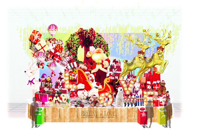 家族・友人・恋人と育む“大きな愛”をテーマに、動物やおもちゃなどみんなで過ごす時間を表現しました。ステージ前のボタンを押すとトナカイやクマが動き出しご来店のお客様をお出迎えします。