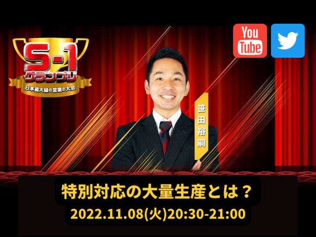 株式会社営業ハック(本社:東京都港区)代表取締役社長笹田裕嗣が2022年11月19日(土)に開催される『S1グランプリ』のファイナリストに選出されました。開催が近づいて参りましたので、事前イベントとして11月7日(月)より毎日YouTube生配信+Twitterスペースにて大会への意気込みや当日の発表内容の一部をご紹介していきます。第2夜である本日11月8日(火)20:30~は、今回のS1グランプリを通して笹田が伝えたいことを「特別対応の大量生産」をキーワードにお話します。