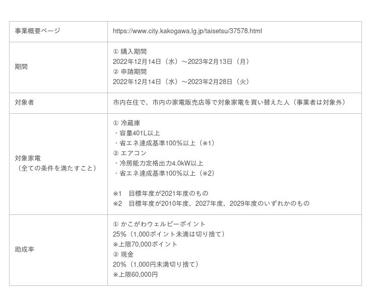 省エネ家電への買替対象期間中に、市内の家電販売店等において対象家電を購入設置した市民に対し、かこがわウェルピーポイント、もしくは現金での助成が行われます。