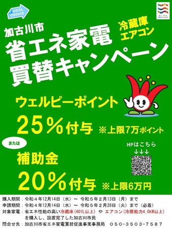 株式会社フューチャーリンクネットワーク(本社:千葉県船橋市、代表取締役:石井丈晴)は、兵庫県加古川市(市長:岡田康裕)にて、期間中に市内の家電販売店等で省エネ家電を購入した市民に対し、地域ポイント「かこがわウェルピーポイント」を付与する制度を開始しました。この制度は、家庭において消費電力が特に大きい冷蔵庫及びエアコンを省エネルギー性能の高いものへ買替を促進することで、高騰している電気代負担の軽減を支援するとともに、脱炭素社会の実現に近づけることを目的としています。