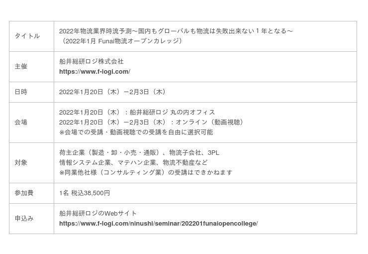 1月に開催する『Funai物流オープンカレッジ(2022年1月)』の講座では、