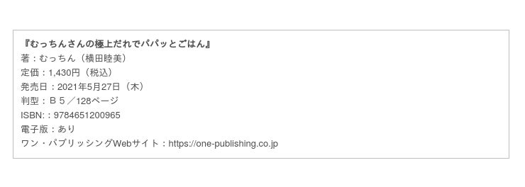 ワン・パブリッシング料理書のSNSアカウントおよびむっちんさんのSNSアカウントをチェックしてください。