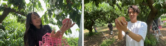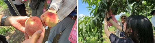 もも狩りを初めて体験する社員も多く、もぎり方を教わりながら一つひとつ丁寧に収穫していました。自身で採ったももを両手で大切そうに包み込み、持ち帰る社員の姿も多く見られました。