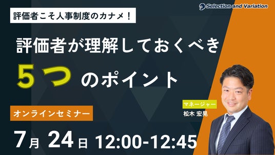 組織・人事コンサルティングファームであるセレクションアンドバリエーション株式会社(以下、当社、東京都千代田区丸の内、大阪市西区、名古屋市西区 / 代表取締役社長:平康慶浩/ URL:https://sele-vari.co.jp/ )は『評価者こそ人事制度のカナメ!評価者が理解しておくべき5つのポイント』セミナーを2025年7月24日(木)12:00~12:45に開催することをお知らせいたします。