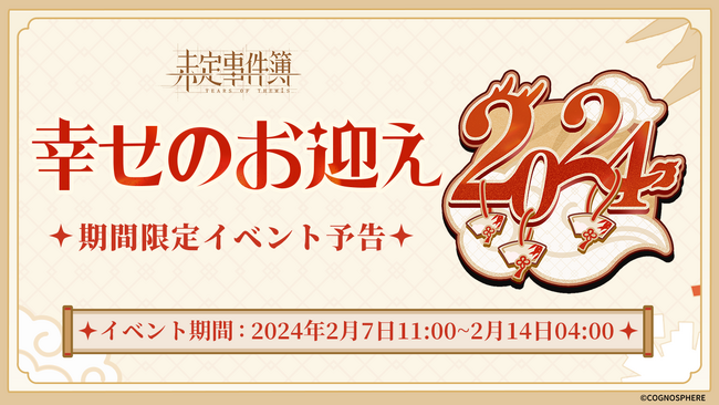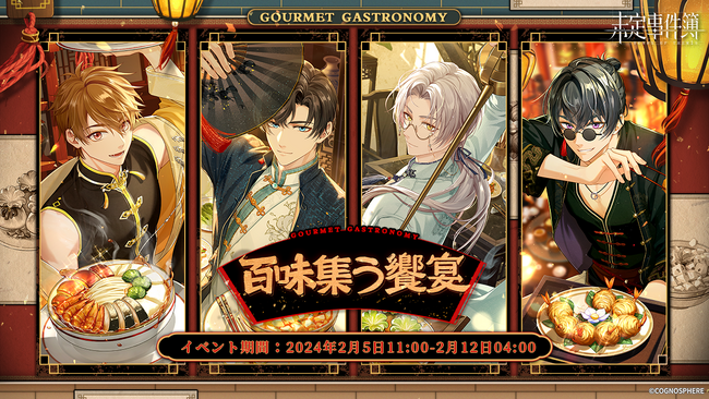 株式会社COGNOSPHERE (本社:東京都渋谷区、代表取締役社長:李 承天)は、女性向け恋愛ミステリーゲーム『未定事件簿』において、本日2月5日(月)より、期間限定イベント『百味集う饗宴』を開催いたしました。