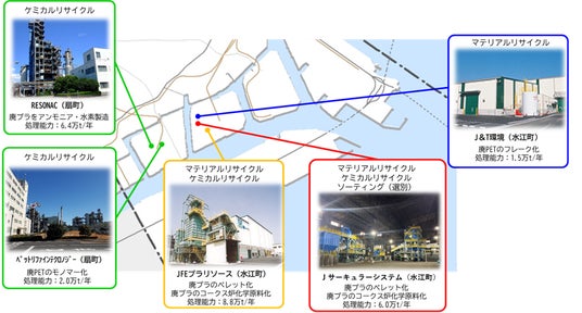 川崎市の臨海部にはプラスチックをリサイクルする事業者が複数社立地していて、各事業者においてリサイクルできる量の合計は国内最大級で、川崎市民が1年間に排出するペットボトルの約7倍、プラスチック資源は約14倍もリサイクルすることができ、国内プラスチックリサイクル量(約200万t)の1割以上を処理できる施設が集積しています。