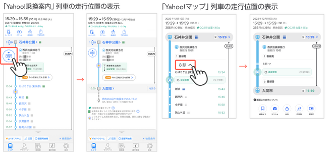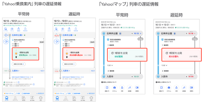 「Yahoo!乗換案内」「Yahoo!マップ」はこれまで、2023年2月にJR東日本の一部在来線や小田急電鉄(※1)、2023年8月に東京メトロ(※2)、2023年10月に都営地下鉄(※3)において、リアルタイムな接近情報や遅延情報などをルート検索結果画面に表示する機能を提供しています。
