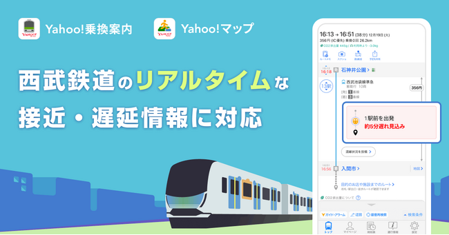 LINEヤフー株式会社が提供する「Yahoo!乗換案内」(iOS版、Android版)と「Yahoo!マップ」(iOS版、Android版)は本日、西武鉄道のリアルタイムな位置情報や遅延情報などをルート検索結果画面に表示する機能(以下、本機能)の提供を開始しました。