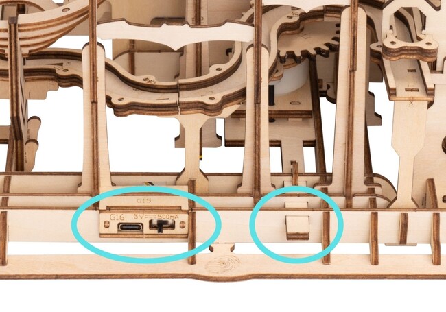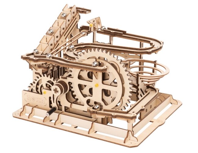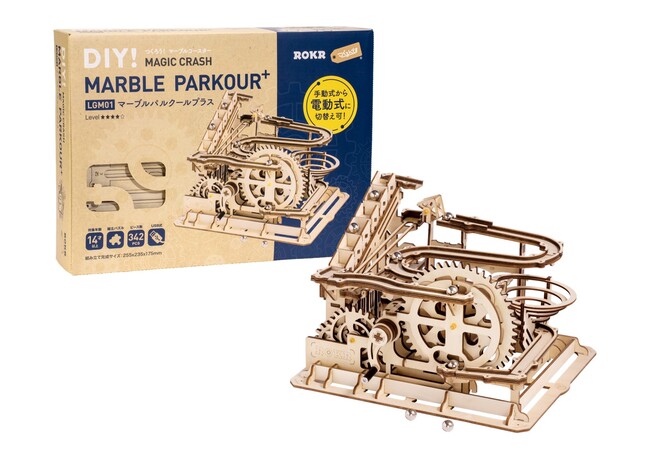 つくるんです(R)ブランドスタート以来、ウッドパズルシリーズの中で圧倒的人気を誇っていたコースターシリーズ。手でハンドルを回すとギアが動いて、ころころと球が転がっていく仕掛け付きの3Dウッドパズルです。今回の「マーブルパルクールプラス」は、手動のみで動く従来モデルの「マーブルパルクール」から、電動式と手動式が切り替えられるよう進化。今まで通り手でハンドルを回して楽しむもよし、電動式で球が転がっていく様子を眺めるのもよしと、より楽しみ方が増えたウッドパズルです。