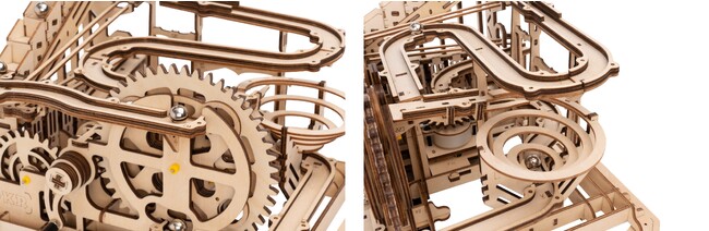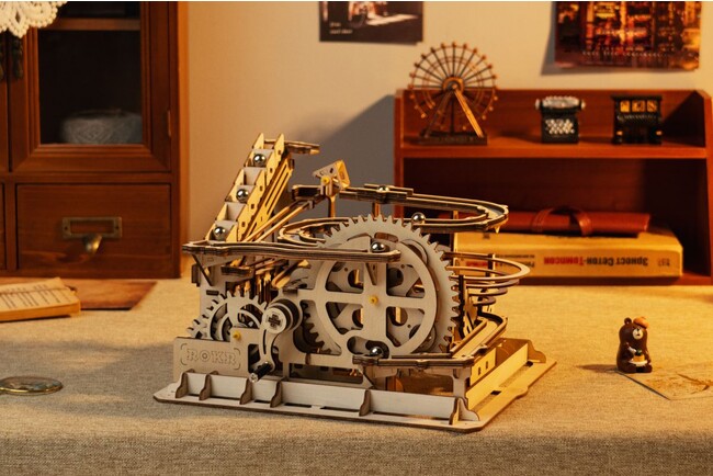 「マーブルパルクールプラス」のピース数は342、制作目安時間は約5時間。集中してパーツを組み立てている時はもちろん、完成後にコースターを動かしている時も、時間を忘れて楽しめるウッドパズルです。球が転がるルートが2つあり、いろいろな方向にボールが走るので、飽きずにずっと見ていられます。また、パーツ同士がかみ合う音や、球がころころと転がる音は心地よく癒されます。コースターシリーズをつくったことがあるという方も、そうでない方も、進化した「マーブルパルクールプラス」で、ぜひつくる楽しさをご体験ください。