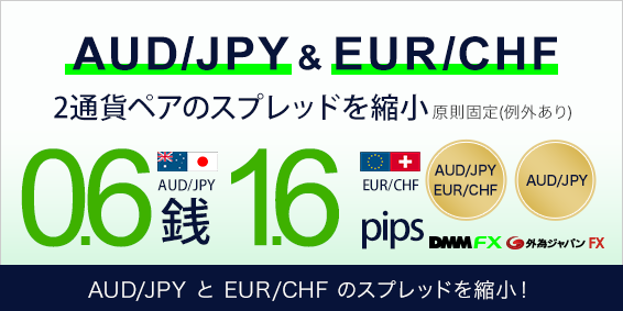 株式会社DMM.com証券(本社:東京都中央区、代表取締役 谷川龍二)が提供する【DMM FX】ならびに【外為ジャパンFX】において、2022年4月5日(火)17時00分より「AUD/JPY(豪ドル/円)」および「EUR/CHF(ユーロ/スイスフラン)」の基準スプレッドを縮小いたしましたので、ご報告いたします。