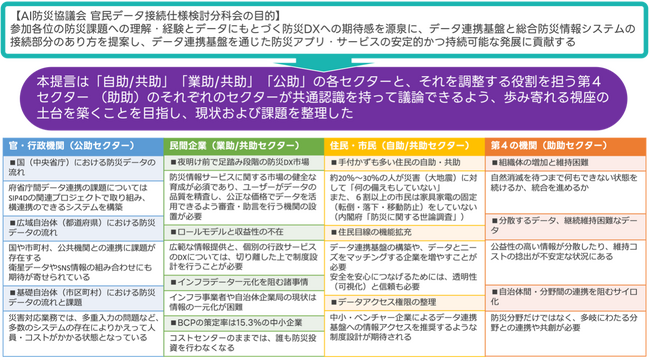 本日、AI防災協議会 官民データ接続仕様検討分科会(以下、分科会)は、「防災アプリ・サービスのための官民データ連携における諸課題と解決法に関する提言―オープンな議論に向けた土台づくり―」を公表しました。