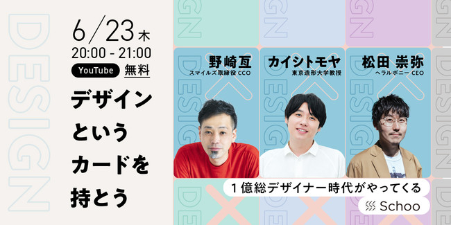 インターネットでの学びや教育を起点とした社会変革を行う株式会社Schoo(本社:東京都渋谷区、代表取締役社長CEO:森 健志郎、以下「スクー」)は、2022年6月よりオンライン学習コミュニティ『Schoo』にて、「デザインというカードをもとう」をテーマに、全ビジネスパーソン向けにデザインの力を身につけるための授業ラインナップを注力拡大しています。その一環として2022年6月23日(木)に、「1億総デザイナー時代」に備えて企業や個人がどのようにデザインを使えばいいのかを考えるウェビナーを開催します。参加費は無料です。