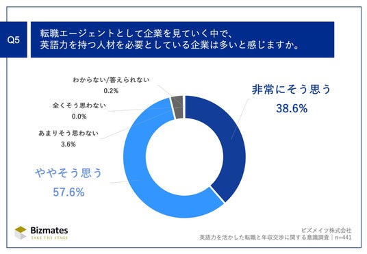 「Q5.転職エージェントとして企業を見ていく中で、英語力を持つ人材を必要としている企業は多いと感じますか。」(n=441)と質問したところ、「非常にそう思う」が38.6%、「ややそう思う」が57.6%という回答となりました。