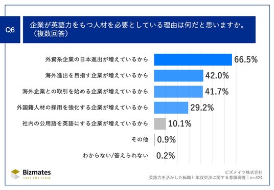 Q5で「非常にそう思う」「ややそう思う」と回答した方に、「Q6.企業が英語力をもつ人材を必要としている理由は何だと思いますか。(複数回答)」(n=424)と質問したところ、「外資系企業の日本進出が増えているから」が66.5%、「海外進出を目指す企業が増えているから」が42.0%、「海外企業との取引を始める企業が増えているから」が41.7%という回答となりました。