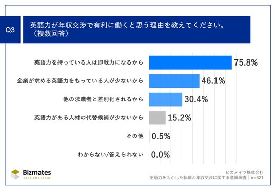 Q2で「非常に有利に働く」「やや有利に働く」と回答した方に、「Q3.英語力が年収交渉で有利に働くと思う理由を教えてください。(複数回答)」(n=421)と質問したところ、「英語力を持っている人は即戦力になるから」が75.8%、「企業が求める英語力をもっている人が少ないから」が46.1%、「他の求職者と差別化されるから」が30.4%という回答となりました。