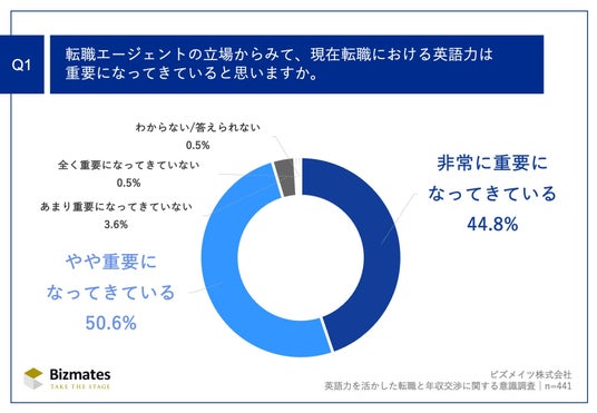 「Q1.転職エージェントの立場からみて、現在転職における英語力は重要になってきていると思いますか。」(n=441)と質問したところ、「非常に重要になってきている」が44.8%、「やや重要になってきている」が50.6%という回答となりました。