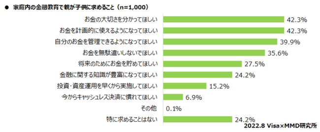 高校生の親1,000人を対象に、家庭内の金融教育で親が子供に求めることについて聞いたところ(複数回答可)、「お金の大切さを分かってほしい」と「お金を計画的に使えるようになってほしい」がともに42.3%で最も多く、次いで「自分のお金を管理できるようになってほしい」が39.9%、「お金を無駄遣いしないでほしい」が35.6%となった。