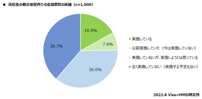 高校生の親1,000人を対象に、家庭内での金融教育の実施について聞いたところ、「実施している」が16.9%、「以前実施していた(今は実施していない)」が7.8%、「実施していないが、実施しようとは思っている」が36.6%、「全く実施していない(実施する予定もない)」が38.7%となった。