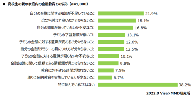続いて、高校生の親の家庭内の金融教育での悩みについて聞いたところ(複数回答可)、「自分の金融に関する知識が不足していること」が21.9%で最も多く、次いで「どこから教えて良いのか分からないこと」が18.1%、「自分の知識が誤っていないか不安なこと」が16.8%となった。
