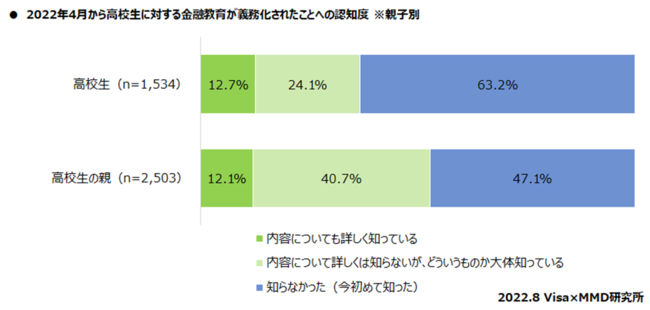 高校生の金融教育の義務化について「知らなかった」のは高校生が63.2%、高校生の親は47.1%