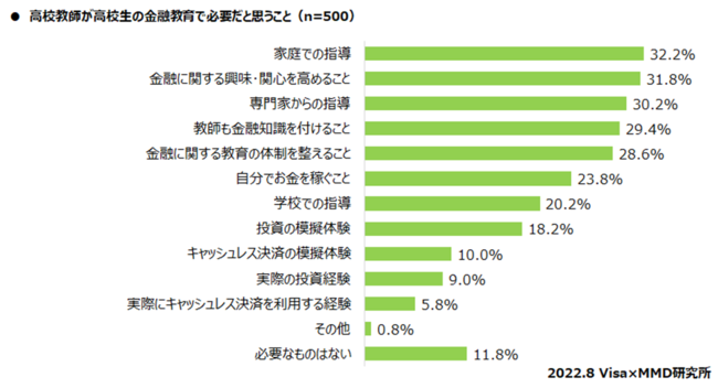 次に、高校教師向け調査で予備調査から高校教師500人を抽出し、高校生の金融教育で必要だと思うことについて聞いたところ(複数回答可)、「家庭での指導」が32.2%で最も多く、次いで「金融に関する興味・関心を高めること」が31.8%、「専門家からの指導」が30.2%となった。
