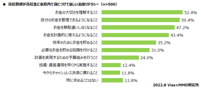 次に、高校教師500人を対象に、高校生に家庭内で身につけてほしい金融リテラシーについて聞いたところ(複数回答可)、「お金の大切さを理解すること」が52.4%で最も多く、次いで「自分のお金を管理できるようになること」が50.4%、「お金を無駄遣いしなくなること」が47.2%となった。