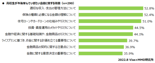 次に、今後金融に関して学びたいと回答した高校生290人を対象に、今後学んでいきたい金融に関する項目について聞いたところ(複数回答可)、「適切な収入・支出の管理方法について」が52.8%で最も多く、次いで「保険の種類と必要になる金額の理解について」が52.4%、「住宅ローンやカードローンの仕組みやリスクについて」が51.0%となった。