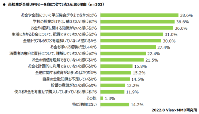 次に、高校生の金融リテラシーを「どちらかといえば身につけていないと思う」もしくは「身につけていないと思う」と回答した高校教師303人を対象に、高校生が金融リテラシーを身につけていないと思う理由について聞いたところ(複数回答可)、「お金や金融について学ぶ機会が今までなかったから」が38.6%で最も多く、次いで「学校の授業だけでは、補えないと感じるから」が36.6%、「お金や経済に関する知識がないと感じるから」が36.0%となった。