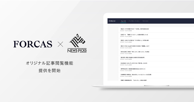 営業DXソリューション「FORCAS」は、同じくユーザベースグループが提供するソーシャル経済メディア「NewsPicks」と連携し、2023年3月16日(木)より新たにFORCASからNewsPicksオリジナル記事にアクセスできるようになります。