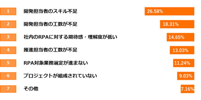 さらに、3位以下(「社内のRPAに対する期待感・理解度が低い(14.65%)」、「推進担当者の工数が不足(13.03%)」「RPA対象業務選定が進まない(11.24%)」「プロジェクトが組成されていない(9.03%)」)は、いずれもRPA導入の推進に関する課題となっています。