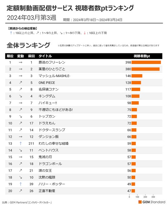 エンタテイメント業界に向けたデータ×デジタルマーケティングサービスを提供するGEM Partners株式会社(ジェムパートナーズ、所在地:東京都港区、代表取締役:梅津文)は3月28日、複数の定額制動画配信サービスを横断集計した2024年3月第3週(2024年3月18日~3月24日)のコンテンツ別(※1)視聴者数ptランキング(全体・男性・女性)を発表します。