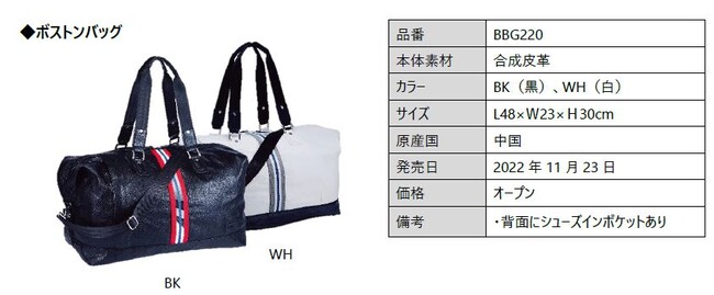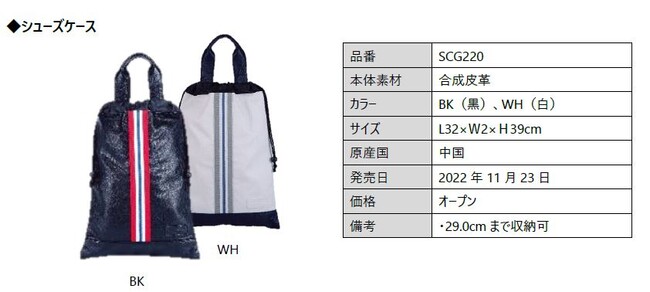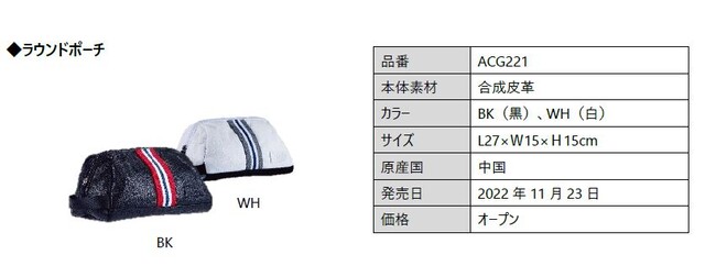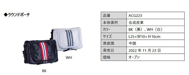 『クラシックシリーズ』は風合いの良い合成皮革にカラーテープがアクセントになっており、ボストンバッグとトートバッグにはシューズインポケット付き、ラウンドトートバッグにはボトルポケット付きで、ゴルファーに嬉しい機能を装備しています。また、ポーチ類やシューズケースも新たにラインアップに加わり、ポーチ類は小物を小分けにできるポケットが充実、 シューズケースは出し入れしやすい巾着タイプとなっています。