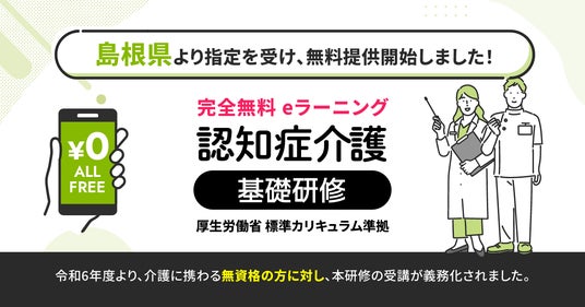 本サービスでは、島根県内の約2,000の介護サービス事業所を対象に、スマートフォンやパソコンから手軽に受講できるeラーニング形式で「認知症介護基礎研修」を無料提供しています。研修では、認知症に関する基礎知識や、適切な対応方法、支援のあり方を体系的に学ぶことができ、現場に求められる基本的なスキルを習得することが可能です。