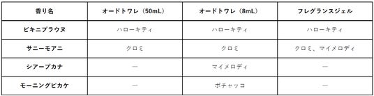 アイテムは、海辺の情景を表現した4種の香水と、夏の太陽に映えるラメ※1&パール※2入りのフレグランスジェルを展開。香水は50mL(フルボトル)と8mL(ミニサイズ)を用意し、「ハローキティ」と「クロミ」がデザインされたフルボトルには限定ステッカーが付属します。ラメ※1とパール※2がきらめくジェルは、デコルテなどのハイライトとして輝きを演出。また、4種の保湿成分※3が夏の日差しで乾燥しがちな肌をケアします。