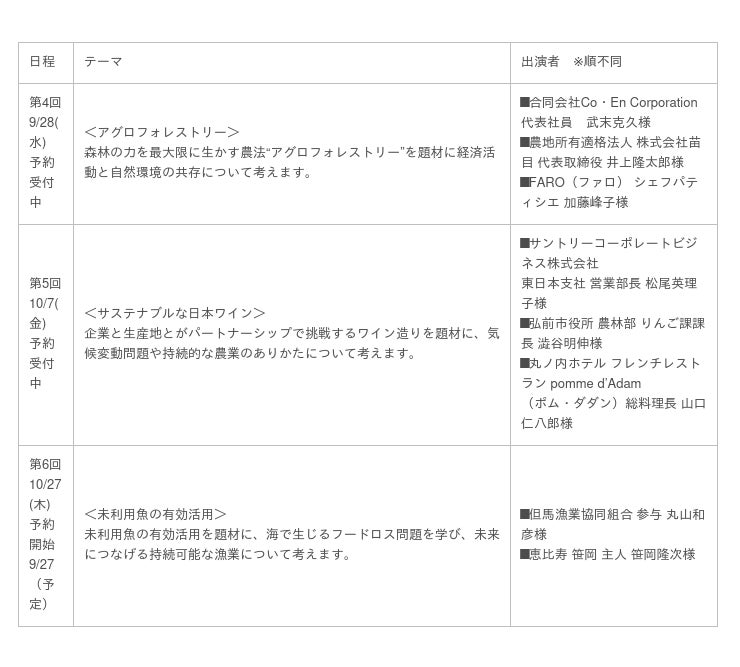 既に開催済の第1回~第3回は全て会場満席となり、ご参加いただいた方からは「普段何気なく食べていた食材について、生産者の取り組みを考えるきっかけができた」、「食品を買う前に産地だけでなくその製造過程も考えてみようと思った」、「フードロス対策など、自分にできることには積極的に取り組んでいきたい」といった、未来への行動変容につながる前向きな感想を多数いただきました。
