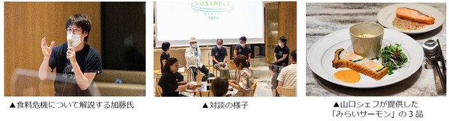 加藤氏からは、「Eating is Voting」という言葉や「消費者ひとりひとりがメディアである」というコメントなど、私たちの日々の消費行動の積み重ねが、未来をより良い方向に導くことができるというメッセージをいただきました。満畑氏、戸川氏からは、今後の事業拡大と海洋保全活動への抱負が語られ、「みらいサーモン」への期待が高まりました。最後に山口シェフは、海洋国日本の豊かな食文化や海洋資源を守るために必要なのは、自ら学び続けること、そして「社会的付加価値」の高い商品を選んでいくことだという力強い言葉を投げかけて下さり、私たちの進むべき道を照らしてくれました。