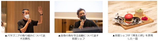 自身でも野菜や魚等の生産に関わる長屋シェフは、パタゴニア プロビジョンズの取り組みを、グローバルな視点から展開される最先端の取り組みであると話した上で、同社の「環境再生」の取り組みを讃える一皿を提供しました。同氏は、「生産の段階でもう料理は始まっている。大人になっても学び続け、『天然/養殖』の2択などではなく、安全で持続可能な食材を選ぶ努力をしてほしい。」と訴えました。
