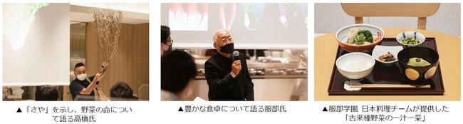 食育の第一人者である服部氏からは、地球上では古来種野菜に限らず様々な動植物が絶滅危機に瀕していることをお話しいただき、未来の子どもたちの豊かな暮らしを守るためには、生命の多様性が維持される社会作りが大切だと学びました。高橋氏は野菜の一生について、蕾をつけて開花し「さや」ができる。それが枯れて種となり、次の世代につながっていくと説明し、私たちは、野菜が自然の中で営む全体のサイクルからその「命」を頂いていることを強調しました。