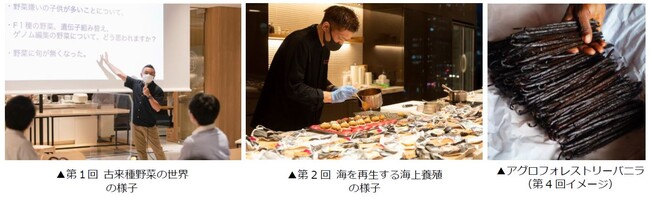 次回第4回は2022年9月28日(水)を予定しており、森林を保全しながら農作物を栽培する農法「アグロフォレストリー」がテーマです。マダガスカル産アグロフォレストリーバニラの輸入・販売を手がけるCo・En Corporationの武末克久氏と、千葉県鴨川市でアグロフォレストリーを実践する農地所有適格法人 株式会社 苗目の井上隆太郎氏をお招きし、人間の経済活動と自然環境の共存について考えます。また会場では、FARO(ファロ)シェフパティシエ 加藤峰子氏が森林への想いを表現した一皿をご提供する予定です。