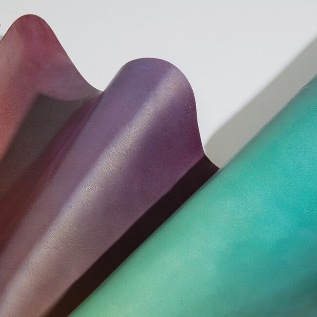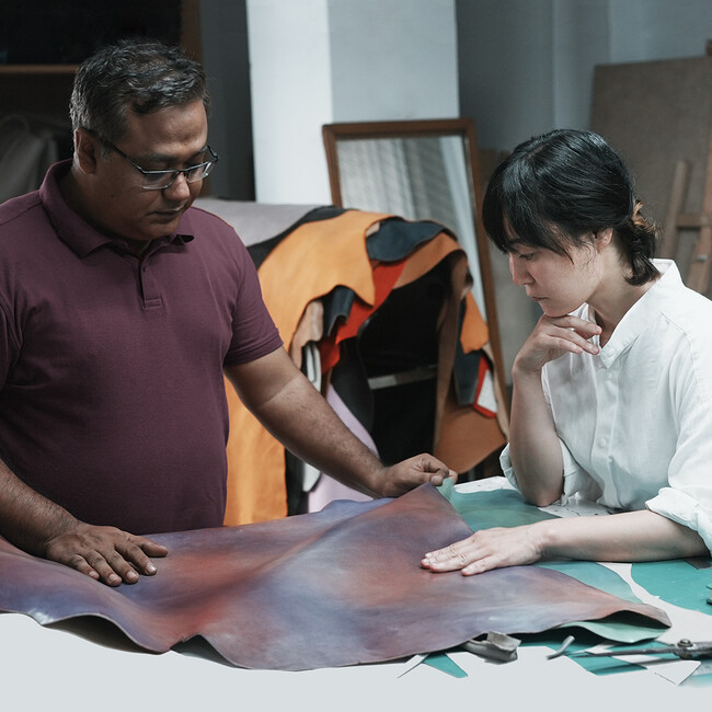 絵画そのもののプリントではなく、層のように重なる豊かな色彩をレザーで表現する。そんな目標を立てて、革の元となる原皮から開発を行いました。試作をするうちに、細かな傷が無い品質の優れた原皮を使い、植物由来のなめしを施すことにより、発色が極めて良くなることがわかりました。
