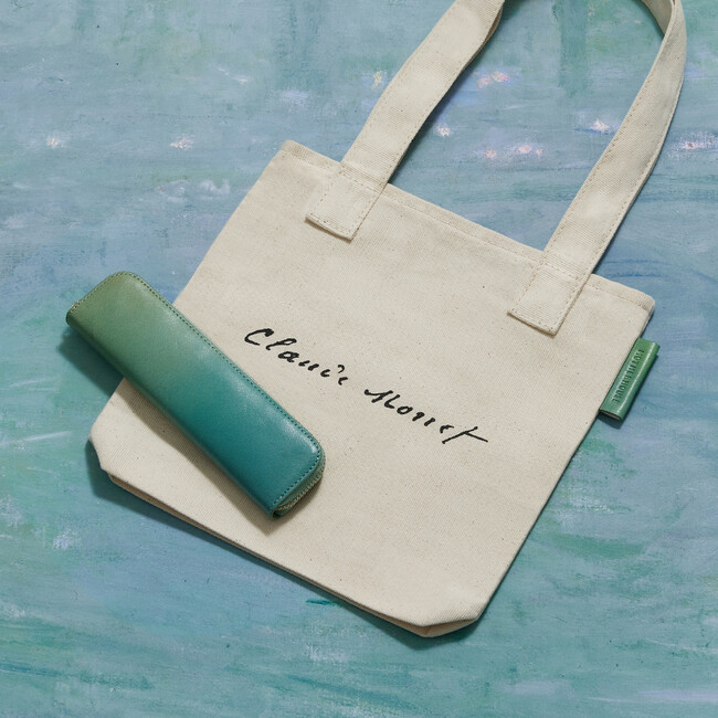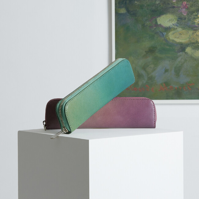 モネの作品がもつ繊細な光の描写と、豊かな色彩のかさなりをレザーで表現しました。コラボレーションの証として、モネのサインとブランドロゴが刻印されています。カラーはグリーンとパープルの2色。染色はすべて手仕事のため、商品ごとに個体差があります。見比べて、お気に入りのひと品を見つけてください。
