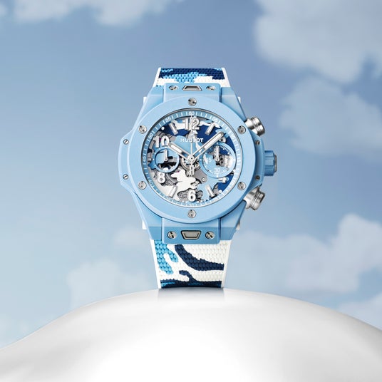 スポーティさと華やかな存在感を併せ持つ「ビッグ・バン ウニコ スカイブルーカモ」は、アイコニックな「ビッグ・ バン ウニコ」のデザインをベースに、美しい発色と質感のセラミック製ケース、ユニークなカモフラージュモチーフの文字盤とラバーストラップを組み合わせた日本限定モデルです。
